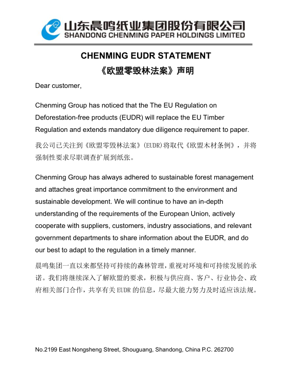 晨鳴集團(tuán)《歐盟零毀林法案》EUDR聲明
